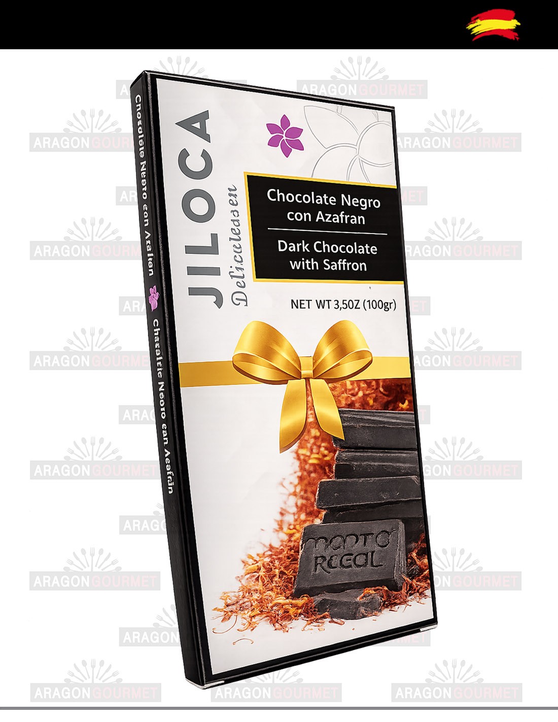 This dark chocolate with saffron (50% cocoa) is made in Teruel by Pastelerías Muñoz, a century-old pastry shop with a long tradition in the city.