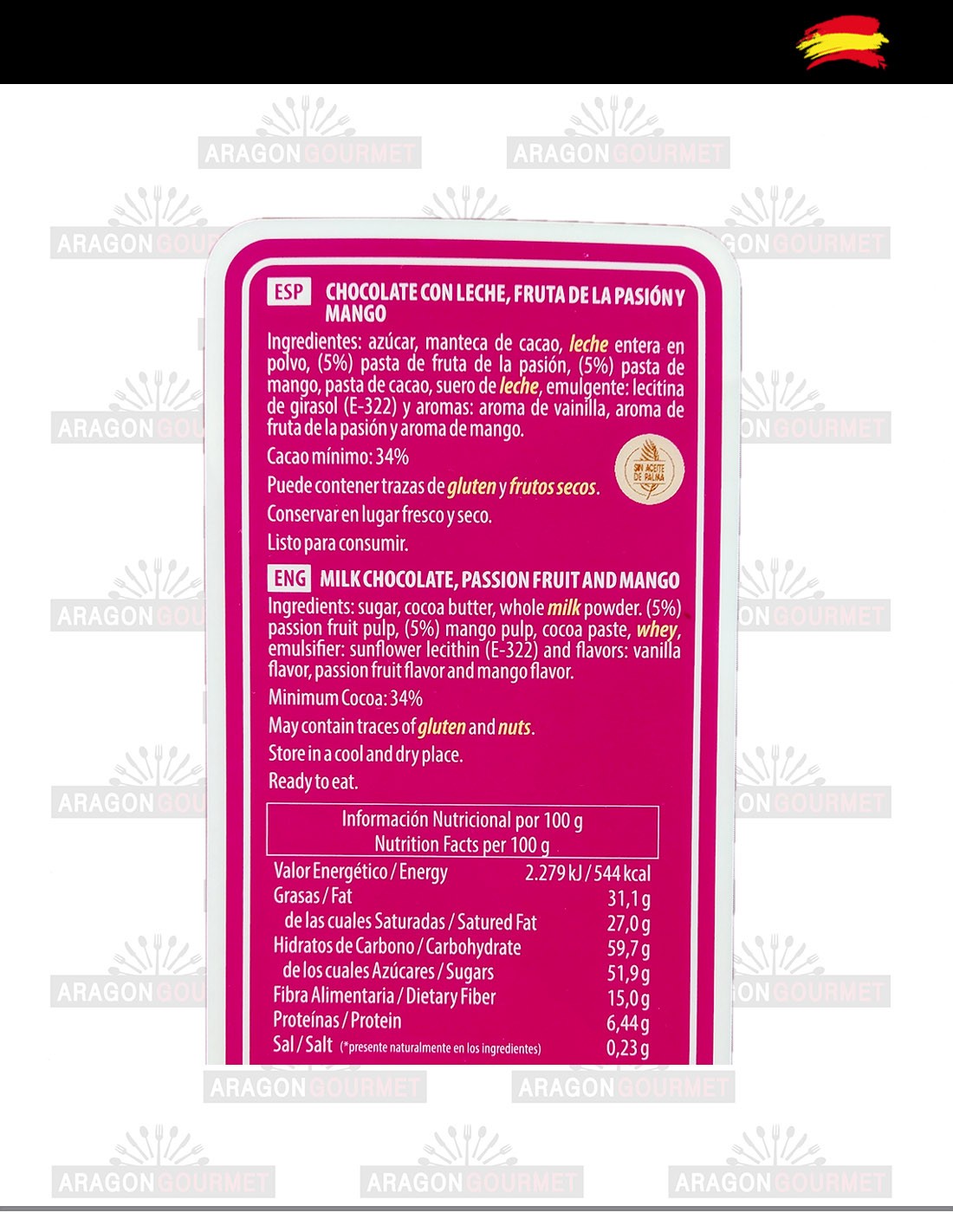 - Ingredientes: Azúcar, manteca de cacao, leche entera en polvo, fasta de fruta de la pasión, pasta de mango, pasta de cacao, suero de leche, lecitina de girasol y aromas