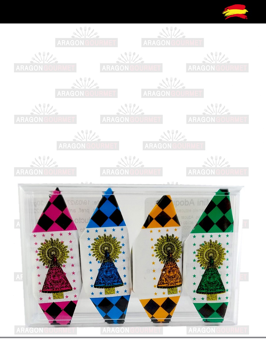 La partie extérieure de l'emballage a toujours une image de la Virgen del Pilar sur fond blanc, avec les extrémités en tissu à carreaux noir et coloré, ressemblant à un cachirulo tandis qu'à l'intérieur apparaît la célèbre lettre aragonaise à trois jotas, généralement comiques, les classiques jotas de picadillo .